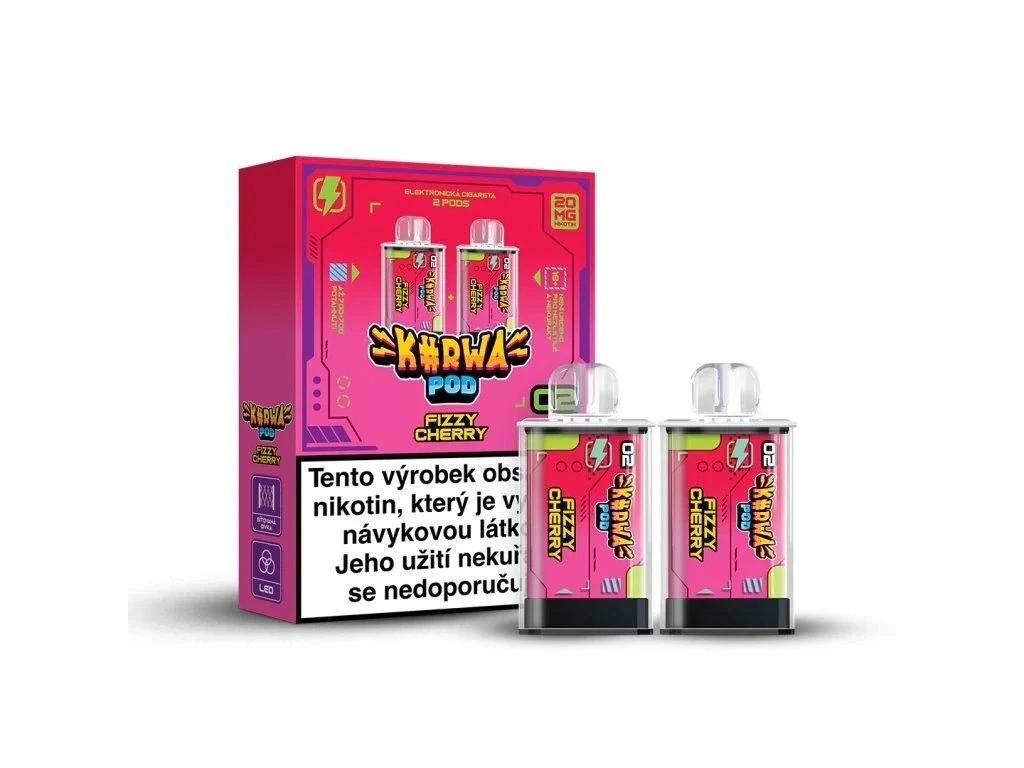Kurwa POD Fizzy Cherry jsou pre-filled pody pro Kurwa POD zařízení. Balení obsahuje 2 pody × 2 ml, každý na ~700 potáhnutí z 20 mg/ml nikotinové soli. Žádné plnění, žádná příprava - zaklipuješ do device a jdeš.