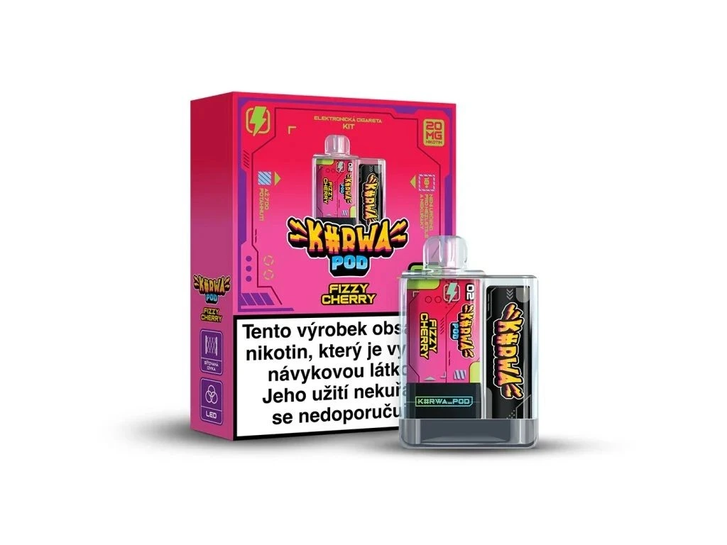 Kurwa POD KIT Fizzy Cherry je identický v hardwaru s ostatními POD KIT variantami - device 500 mAh, USB-C nabíjení, kompatibilní s Kurwa POD cartridge řadou. Přibalenou příchuť je Fizzy Cherry.