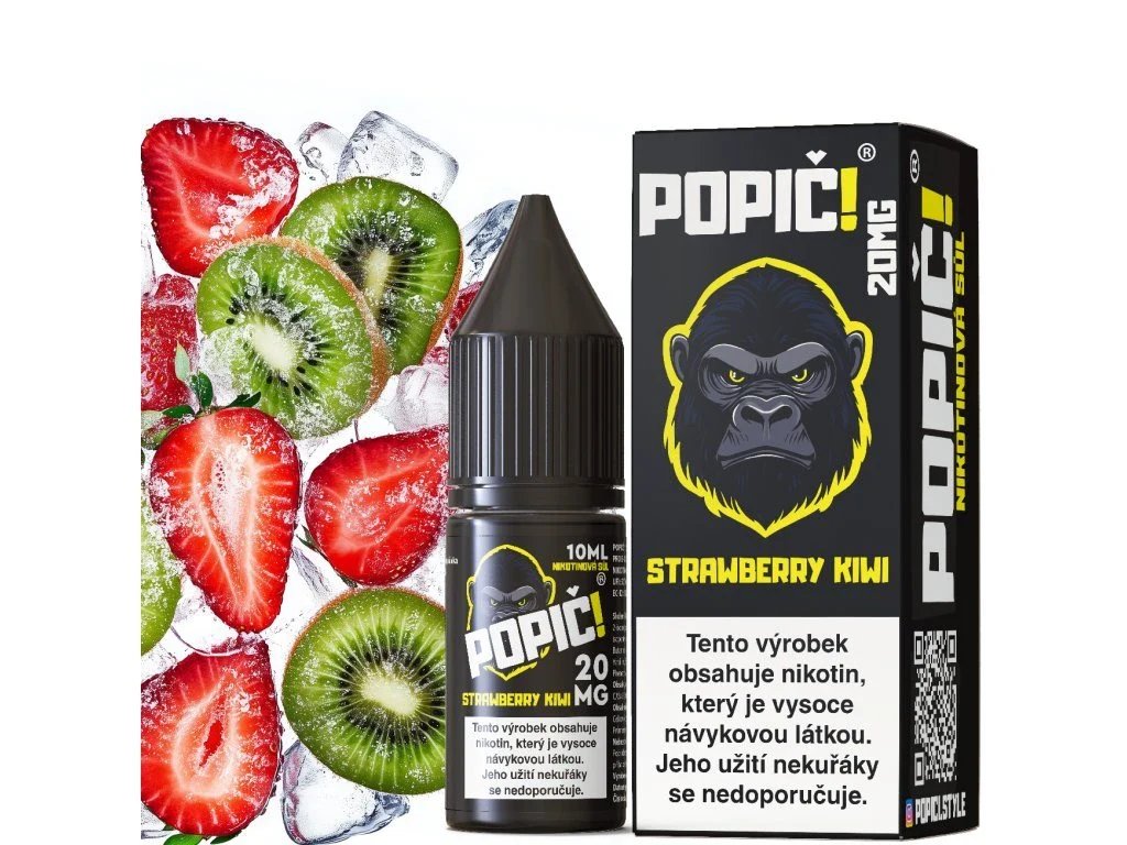 POPIČ! Strawberry Kiwi 20 mg – lahodný e-liquid s kombinací sladkých jahod a svěžího kiwi, ideální pro silný nikotinový zážitek.